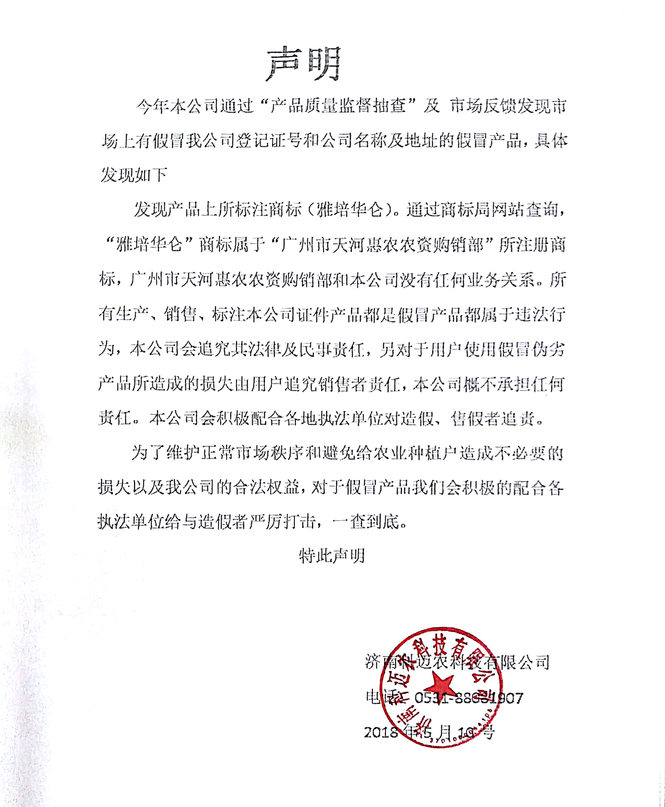 為了維護正常市場秩序和避免給農業種植戶造成不必要的損失以及我公司的合法權益,對于假冒產品我們會積極的配合各地執法單位給予造假者嚴厲打擊,一查到底。